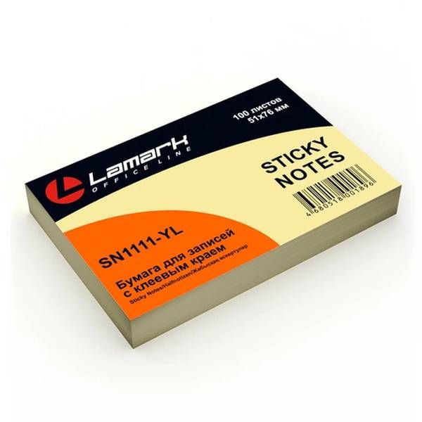 Бумага для заметок Lamark с клеевым краем, цвет желтый пастельный. В блоке 100 листов. Размер 51x76 мм. Листы надежно крепятся на любые поверхности и при удалении не оставляют следов.
