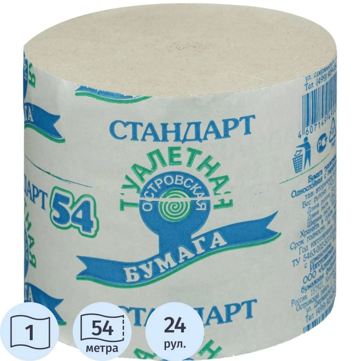 Бумага туалетная 1-сл.ОСТРОВСКАЯ б/втулки сер 54м,24рул/уп