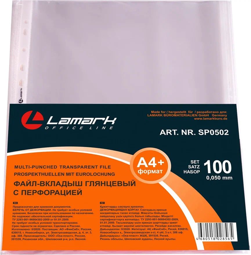 Файлы-вкладыши Lamark А4+ глянцевые выполнены из высококачественной полипропиленовой пленки толщиной 0,050 мм, снабжены универсальной перфорацией, предназначены для хранения и транспортировки неперфорированных документов, 100 штук в упаковке.
