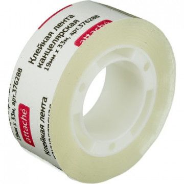 Клейкая лента канцелярская Attache прозрачная с информационным ярлыком. Широко используется в бытовой, банковской и офисной сфере. Размеры: ширина 19 мм х длина 33 метра. Клейкость ленты - 147 Н/м. Для производства канцелярских лент используется сырьё с клеем на основе акриловой эмульсии. Ленты с данным клеевым слоем обладают низкой первоначальной клейкостью и требуют времени для полноценного прилипания к поверхности.