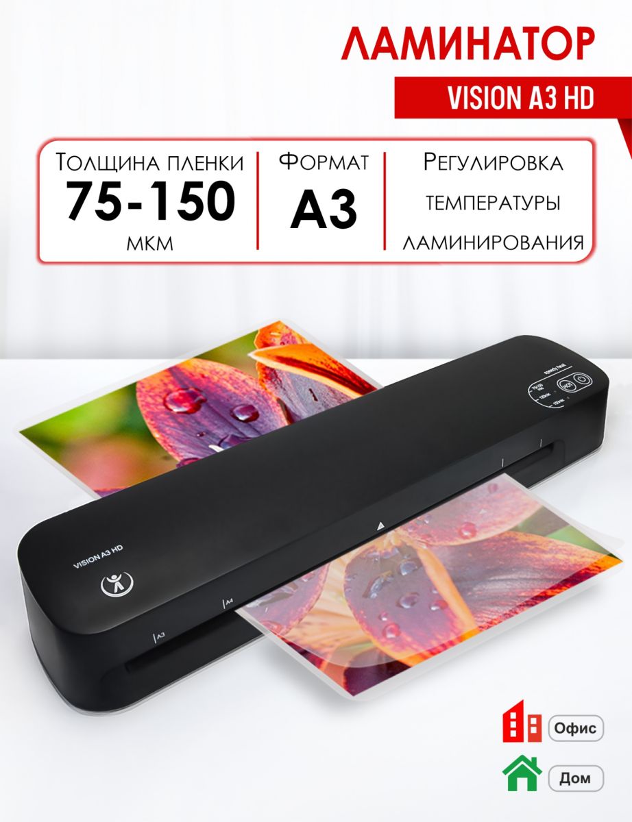 Vision A3 HD - отличная модель недорогого пакетного ламинатора формата А3, в которой инженеры собрали самые необходимые характеристики для качественного ламинирования и сделали ламинатор максимально удобным для пользователя. Немного подробнее: в ламинатор была добавлена регулировка температуры для работы с пленками толщиной 75/100, 125 и 150 мкм! А для удобства пользования было добавлено сразу несколько технологий и опций: "Speedy Heat"- Быстрый Нагрев и готовность к работе за 1 минуту; сенсорная панель управления; выбор толщины пленки; автоматический переход ламинатора в дежурный режим через 30 минут работы. И все это собрано в стильном компактном и прочном корпусе из высококачественного пластика. Vision A3 HD отличается от Vision A4 HD шириной и толщиной ламинирования, а также мощностью.
