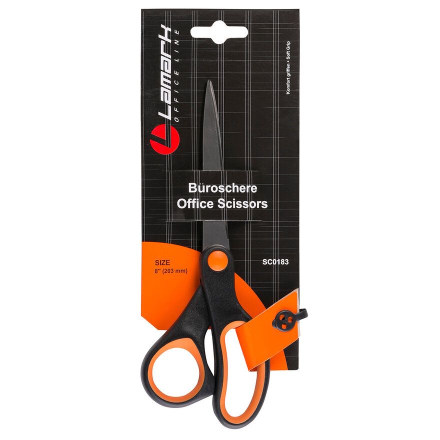 Ножницы канцелярские Lamark. Лезвия из нержавеющей стали, анатомические ручки с мягкими оранжевыми вставкам с удобным захватом обеспечивают комфортную работу с материалами разной плотности. Размер ножниц 20,3 см. Поставляются в блистере с ерослотом.