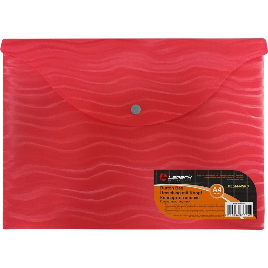 Папка-конверт Lamark на кнопке изготовлена из плотного пластика (высококачественный полипропилен) толщиной 0,4 мм с фактурой “ВОЛНА”, предназначена для документов формата А4. Цвет непрозрачный насыщенный красный. Для надежного хранения и транспортировки документов.
