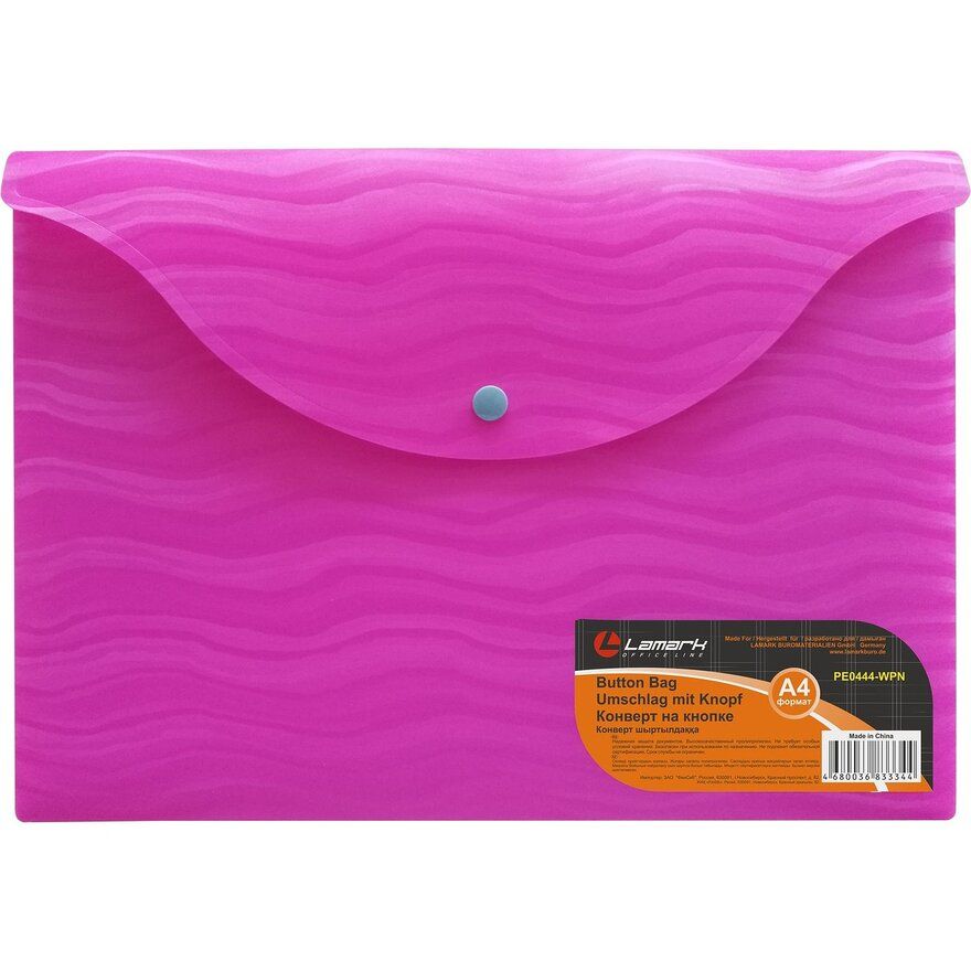 Папка-конверт Lamark на кнопке изготовлена из плотного пластика (высококачественный полипропилен) толщиной 0,4 мм с фактурой “ВОЛНА”, предназначена для документов формата А4. Цвет непрозрачный насыщенный розовый. Для надежного хранения и транспортировки документов.