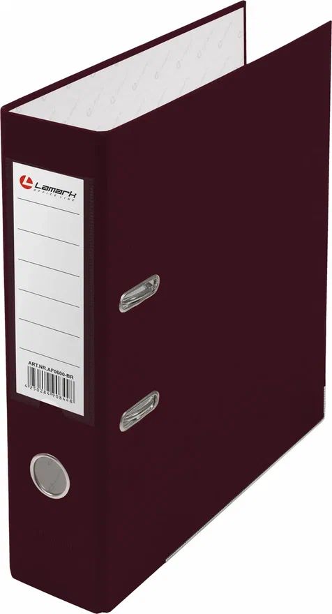 Папка-регистратор LAMARK РР с арочным механизмом изготовлена из плотного картона, с внешней стороны заламинированного полипропиленовой пленкой (РР) с текстурой "лен", внутри оклеена бумагой с алфавитно-цифровым полем для классификации на левой стороне. Прорези на крышке удерживают папку закрытой даже при большом количестве документов. Ширина корешка 80 мм. Вместимость до 480 листов формата А4. Нижние края защищены металлическим кантом, что сохраняет папку при длительной интенсивной эксплуатации. Карман со сменной индексной вставкой на корешке. Цвет бордовый. Поставляются в разобранном виде по 50 штук в транспортной упаковке.