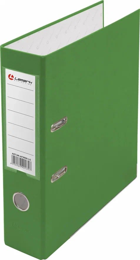 Папка-регистратор LAMARK РР с арочным механизмом изготовлена из плотного картона, с внешней стороны заламинированного полипропиленовой пленкой (РР) с текстурой "лен", внутри оклеена бумагой с алфавитно-цифровым полем для классификации на левой стороне. Прорези на крышке удерживают папку закрытой даже при большом количестве документов. Ширина корешка 80 мм. Вместимость до 480 листов формата А4. Нижние края защищены металлическим кантом, что сохраняет папку при длительной интенсивной эксплуатации. Карман со сменной индексной вставкой на корешке. Цвет светло-зеленый. Поставляются в разобранном виде по 50 штук в транспортной упаковке.