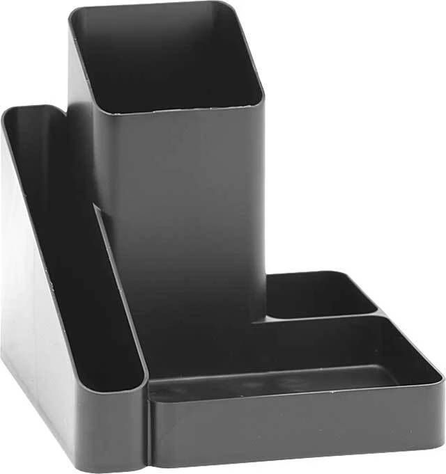 Стильный органайзер классического дизайна и небольшого размера. 4 отделения для канцелярских принадлежностей, визиток и листков для записей. Гладкая глянцевая поверхность. Прочный корпус изделия. Материал - полистирол. Цвет - черный