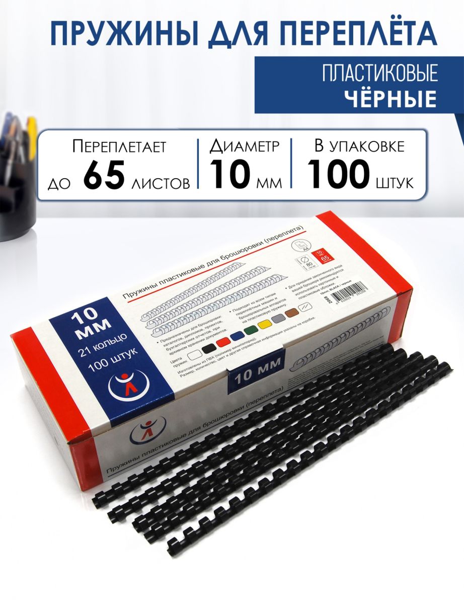 Пружины пластиковые диаметр 10мм, черный, для переплета или брошюровки - предназначены для быстрого и удобного переплета документов, каталогов, дипломов и другой печатной продукции при помощи переплетной машины. Пластиковые пружины можно использовать для переплета бумаги формата А4 или А3 (по короткой стороне), а если документ меньшего размера, то пружину можно обрезать. Можно использовать пластиковые пружины и дома, сшивая, к примеру: тематические подборки рисунков или раскрасок, контурных карт, стихов, схем и даже заламинированных листьев деревьев! Переплет пластиковыми пружинами позволяет, разжав пружину, добавить или удалить листы в документ. Эти пружины подходят ко всем типам переплетных машин и брошюровальных аппаратов на пластиковую пружину. Для придания законченного вида вашей брошюре рекомендуется использовать картонные и пластиковые обложки для переплета.Основные характеристики: Диаметр - 10мм; Цвет – черный; Переплет – до 65 листов бумаги 80гр/м2; 100 штук в коробке; 21 кольцо; Материал ПВХ пластик