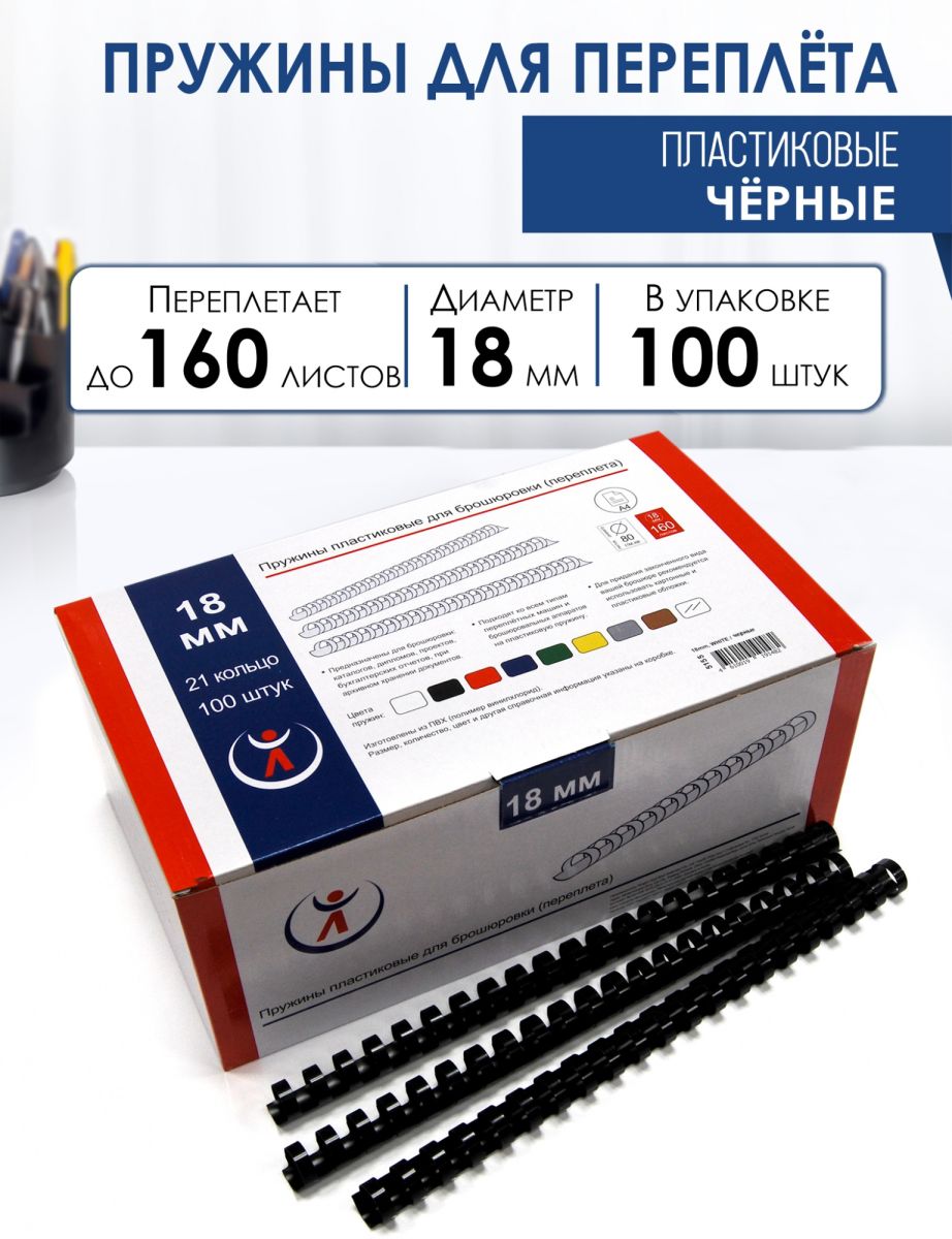 Пружины пластиковые диаметр 18мм, черные, для переплета или брошюровки - предназначены для быстрого и удобного переплета документов, каталогов, дипломов и другой печатной продукции при помощи переплетной машины. Пластиковые пружины можно использовать для переплета бумаги формата А4 или А3 (по короткой стороне), а если документ меньшего размера, то пружину можно обрезать. Можно использовать пластиковые пружины и дома, сшивая, к примеру: тематические подборки рисунков или раскрасок, контурных карт, стихов, схем и даже заламинированных листьев деревьев! Переплет пластиковыми пружинами позволяет, разжав пружину, добавить или удалить листы в документ. Эти пружины подходят ко всем типам переплетных машин и брошюровальных аппаратов на пластиковую пружину. Для придания законченного вида вашей брошюре рекомендуется использовать картонные и пластиковые обложки для переплета.Основные характеристики: Диаметр - 18мм; Цвет – черный; Переплет – до 160 листов бумаги 80гр/м2; 100 штук в коробке; 21 кольцо; Материал ПВХ пласти