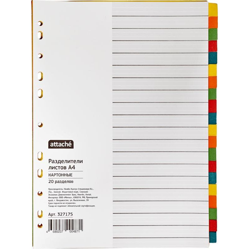 Разделители листов Attache формата А4 изготовлены из прочного картона. Размер - 297x210 мм. Плотность листов - 150 г/кв.м Универсальная перфорация совместима с различными типами папок. В комплекте 20 цветных разделителей листов, а также титульный лист для удобства и быстроты поиска.
