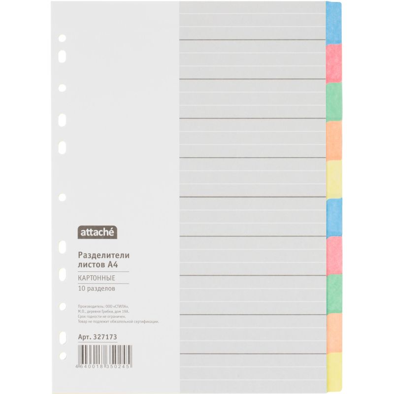 Разделители листов Attache формата А4 изготовлены из прочного картона. Размер - 297x210 мм. Плотность листов - 150 г/кв.м. Универсальная перфорация совместима с различными типами папок. В комплекте 10 цветных разделителей листов, а также титульный лист для удобства и быстроты поиска.