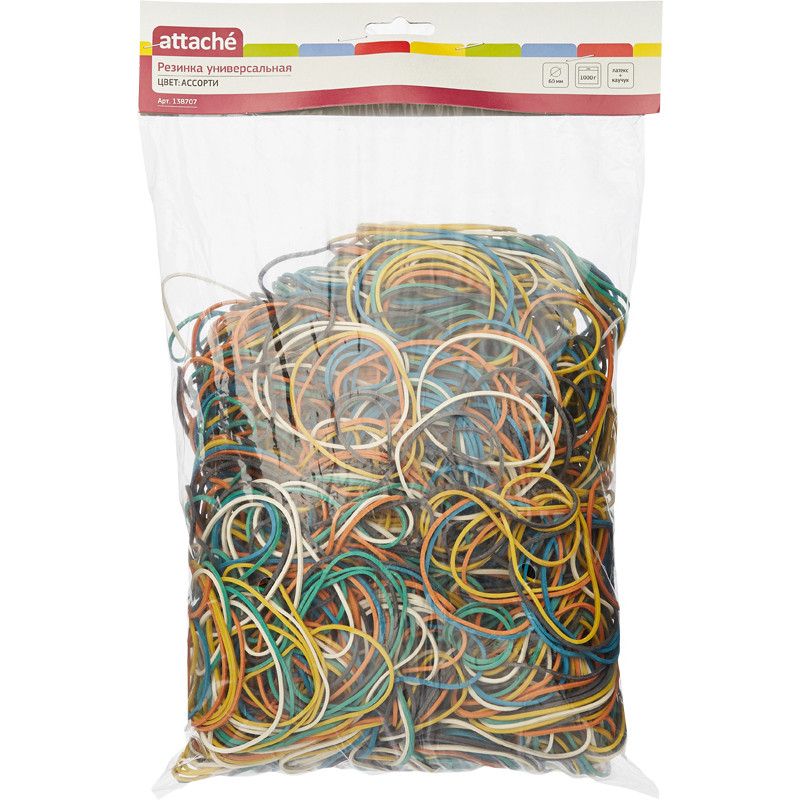 Резинка универсальная 1000г (диаметр 60 мм, толщина 1.5 мм, в ассортименте)Универсальная резинка Attache диаметром 60 мм предназначена для упаковки денежных купюр, скрепления документов, в том числе свернутых в рулон (чертежи, плакаты), мелкой фасовки овощей, зелени, цветов. Товар используют в банках, офисах, торговых точках, фармацевтических компаниях, а также для бытовых нужд. Практичная универсальная резинка изготовлена из прочных и эластичных материалов (каучук и латекс), что позволяет использовать ее многократно, не повреждая и не растягивая. Ориентировочное количество резинок в упаковке - 1800 штук, может варьироваться в силу технологических особенностей производства.
