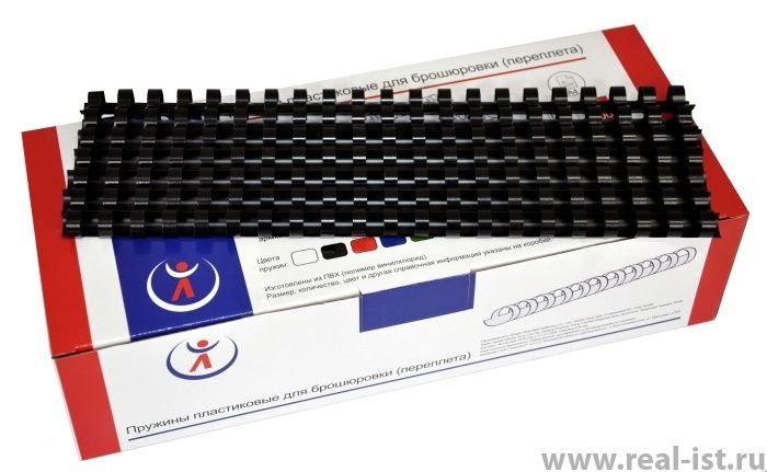 Пружины пластиковые диаметр 16мм, черные, для переплета или брошюровки - предназначены для быстрого и удобного переплета документов, каталогов, дипломов и другой печатной продукции при помощи переплетной машины. Пластиковые пружины можно использовать для переплета бумаги форматом А4 или А3 (по короткой стороне), а если документ меньшего размера, то пружину можно обрезать. Можно использовать пластиковые пружины и дома, сшивая, к примеру: тематические подборки рисунков или раскрасок, контурных карт, стихов, схем и даже заламинированных листьев деревьев! Переплет пластиковыми пружинами позволяет, разжав пружину, добавить или удалить листы в документ. Эти пружины подходят ко всем типам переплетных машин и брошюровальных аппаратов на пластиковую пружину. Для придания законченного вида вашей брошюре рекомендуется использовать картонные и пластиковые обложки для переплета.Основные характеристики: Диаметр - 16мм; Цвет – черный; Переплет – до 145 листов бумаги 80гр/м2; 100 штук в коробке; 21 кольцо; Материал ПВХ пласт